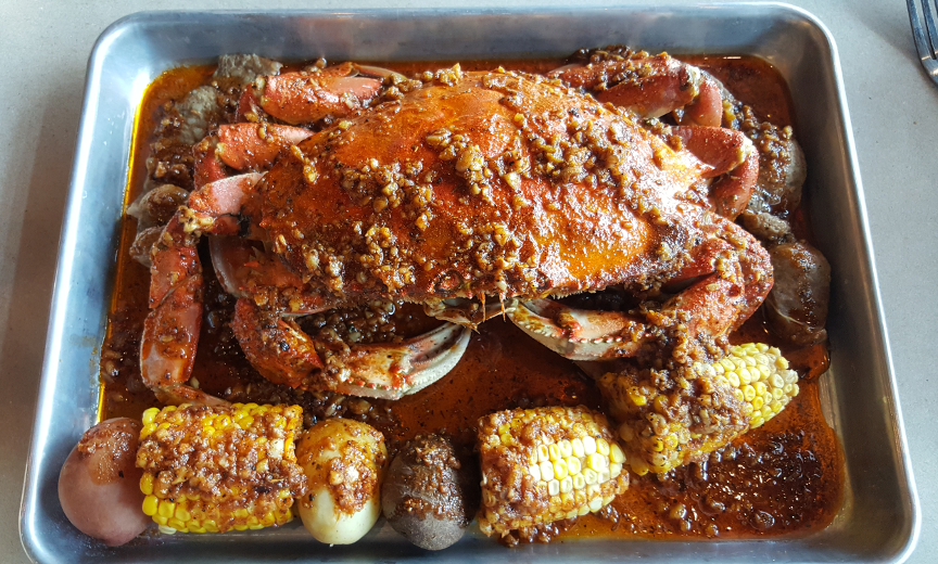 The Crab Balls are delicious — bite-sized and lightly breaded, you get more surface area of crunchiness than with the… Crab Cakes, which are creamy and even less lightly breaded. They’re as good as any we’ve had in NoVa. The Blue Crabs, of which we order a pound, are as expected — fully cooked and seasoned to your preference: Cajun, Garlic Butter, or Lemon Pepper. If you can’t make up your mind, the “Crazy Special” mixes all three. You also select the level of spiciness. We opt for Cajun, Hot, on the theory that a crab joint with “Crazy” in its name is confident in its mastery of Cajun-style. We love the flavor of the seasoning, and the heat does not disappoint. If ordering lobster or crab legs, we’d probably opt for the Garlic Butter.