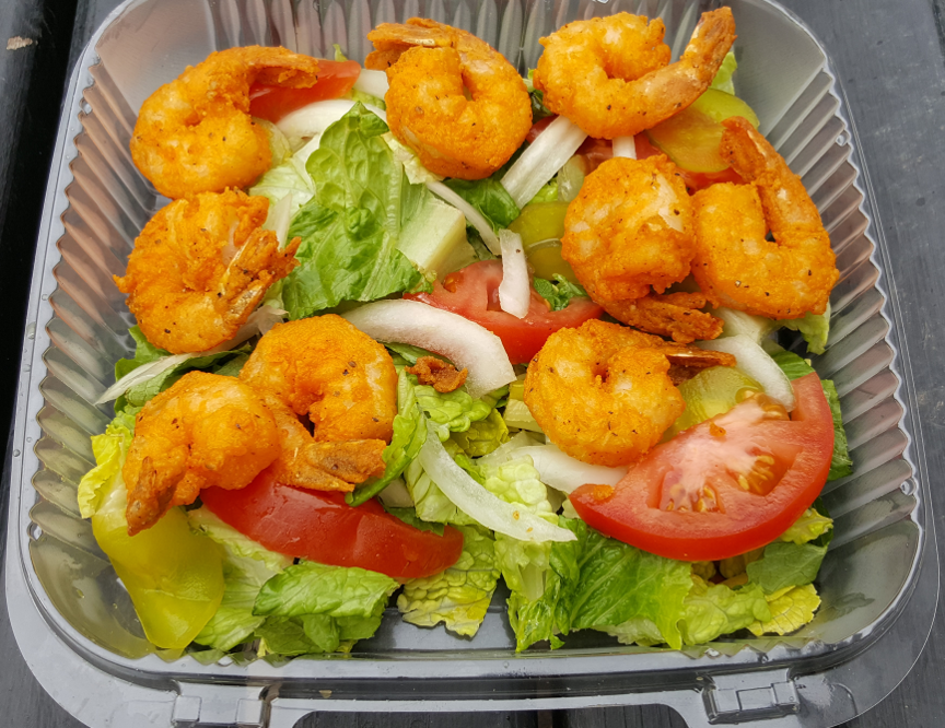 This might be the lightest “fried” shrimp plate ever, and looks better on the plate (or in the take-away box) than in the menu pics. Quick lunch.